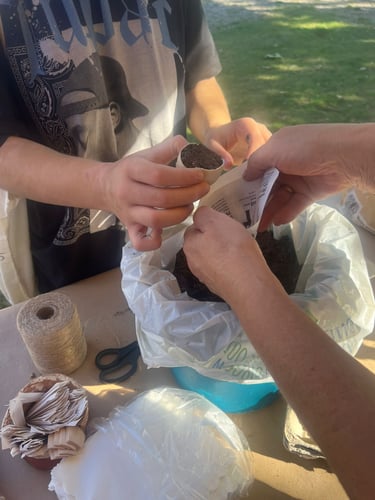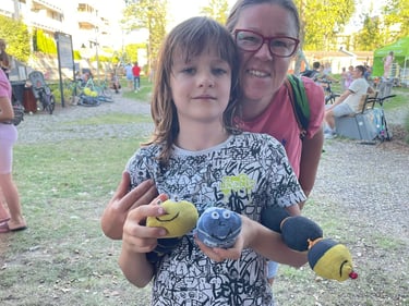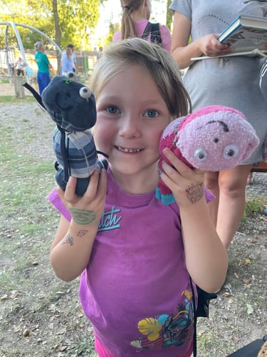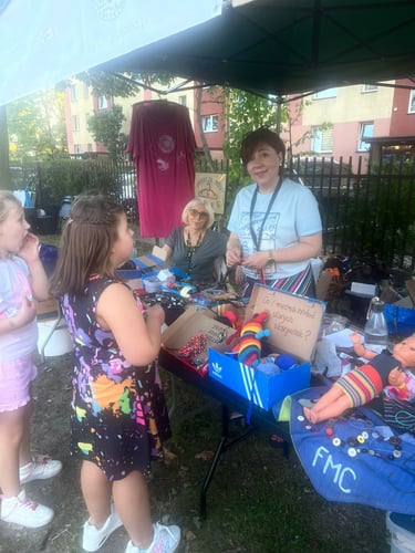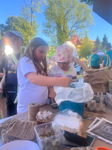 Pytacie o Warsztaty upcyklingowe na Zielonym ekopikniku w Mińsku Mazowieckim - i słusznie, bo było mega! 24 września 2025 r. nasze cztery stoiska odwiedziło chyba milion osób. Zwycięzca wszelkich kategorii, drugoklasista Kuba, zrobił z nami trzyosobową skarpetkową rodzinę, breloki i dostał skarpetkowe etui do telefonu na… guziki na stopce, bo odkrył, że potrafią kręcić się jak bączki… Robiliśmy kompost, sadziliśmy kwiaty, przygotowywaliśmy ekologiczne kosmetyki, ratowałyśmy t-shirty farbami akrylowymi i mazakami na bazie alkoholu. Maskotki ze skarpet i rękawiczek, etui na telefony i przebij dnia - plecione breloki z pociętych starych T-shirtów.